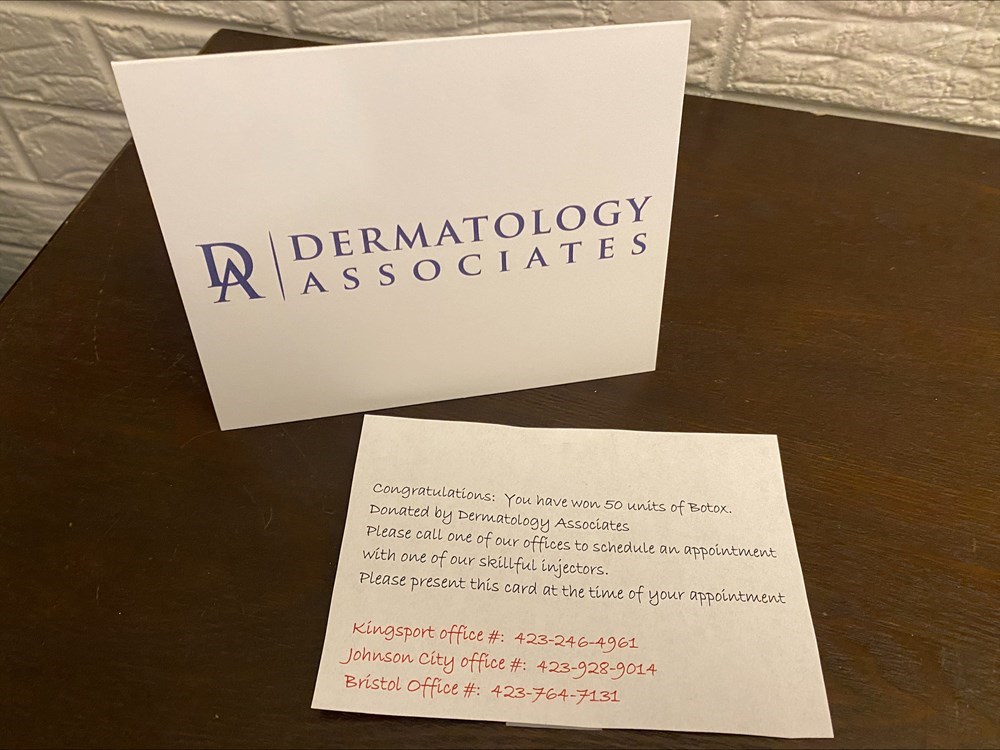 50 units of botox donated by Dermatology & Associates. Units do not have to be used all at once and can be banked for use at future appointments. **Valid at Kingsport location ONLY!