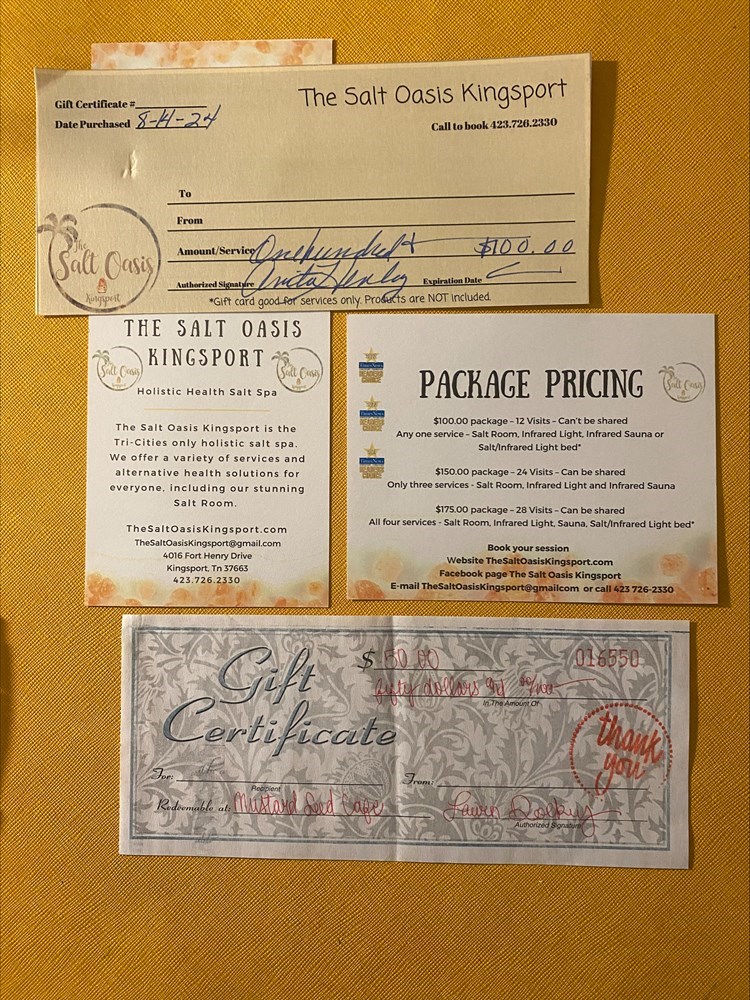 This package features: -$100 gift card to The Salt Oasis Kingsport -$50 gift card to The Mustard Seed Cafe $100 Salt Oasis package equals 12 visits for any one service. The Salt Oasis Kingsport offers the full experience in Salt Therapy, Infrared Light Therapy, Infrared Sauna with Chromotherapy, and Aesthetics Services. In addition to relieving stress and anxiety, Salt and Infrared Therapy provide wellness benefits such as detoxification, pain reduction, and sinus/allergy relief. To view the full service listing/description visit https://www.thesaltoasiskingsport.com The Mustard Seed Cafe offers an eclectic menu of specialty coffees, teas, quiches, sandwiches, salads, soups, and yummy desserts. Some signature items include; The Reuben, The Kitchen Sink Salad, chicken salad, assorted quiches, and caramel cake. To view the full menu, visit https://www.mustardseedcafekingsport.com