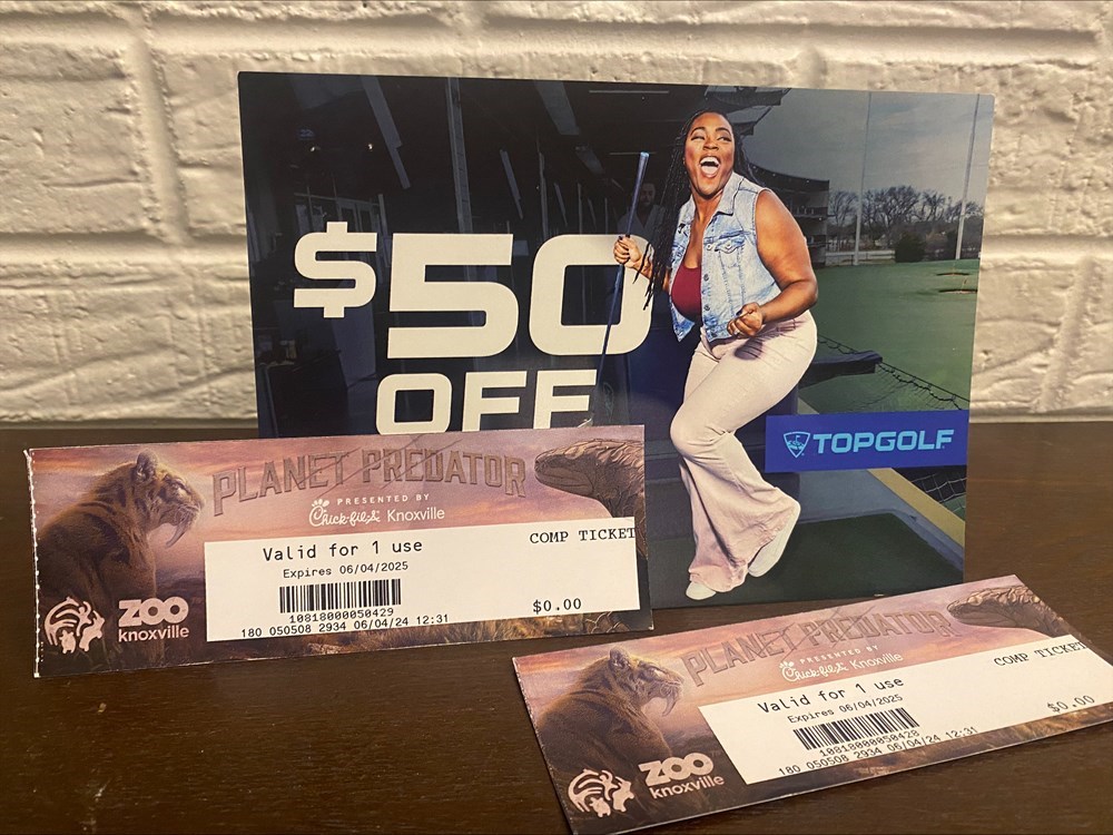 This auction item includes: -2 passes to Knoxville Zoo -$50 gift card to Top Golf https://zooknoxville.org Zoo Knoxville is one of the premiere zoological experiences in the southeast. Committed to sharing 'wildly fun' experiences that educate and inspire, we feature acres of creative habitats for animal lovers of all ages to explore. Fun on the outside, serious about animals on the inside. Zoo Knoxville is committed to being part of the solution to save species from extinction, both locally and globally. https://topgolf.com/us/knoxville/ Welcome to Topgolf Knoxville, the premier entertainment destination in Farragut, TN. Enjoy year-round comfort in our hitting bays with cooling fans in the summer and heated bays in the winter, all with HDTVs in every bay and throughout our sports bar and restaurant. Using our complimentary clubs or your own, take aim at the giant outfield targets and our high-tech balls will score themselves