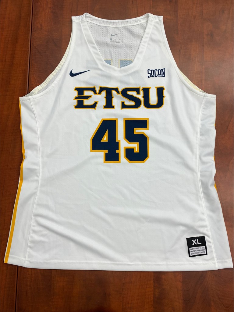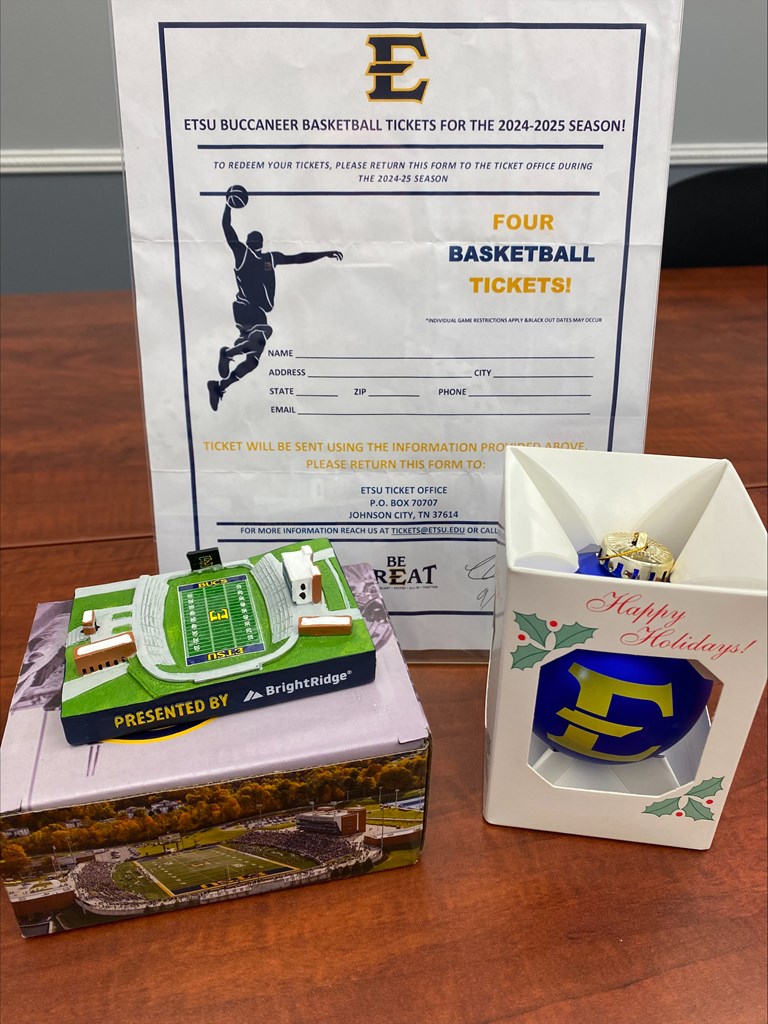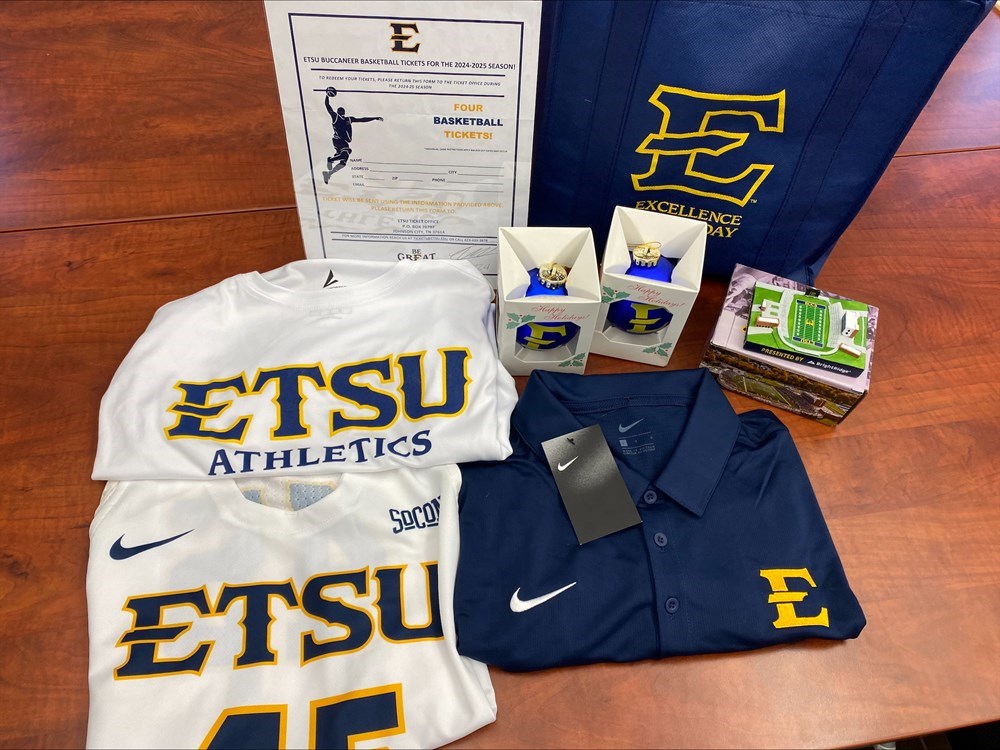 This auction package includes: -4 ETSU Buccaneer Basketball tickets -Men's large long-sleeved T-shirt -Men's large Nike short-sleeved polo shirt -Men's X-large Nike basketball jersey -Football stadium mini replica -(2) ETSU Christmas ornaments -ETSU canvas tote bag
