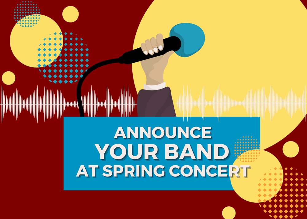🎤🌟 Be the Guest Emcee at the Spring Concert! 🌟🎤 Take center stage and introduce your band's performance in your own unique style! 🎶🎺🥁 With Director approval, you’ll get the chance to make the big announcement and add your personal flair to the show! 🎼✨ Don't miss this one-of-a-kind opportunity to be part of the concert in a whole new way! 🎤👏